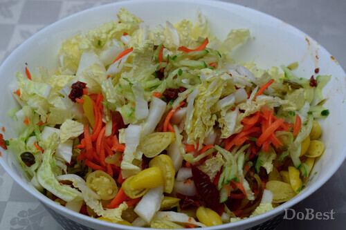 ![]() Zutaten Chinakohl — nach Geschmack Karotten — nach Geschmack Gurken — nach Geschmack Eingelegte Gurken — nach Geschmack Getrocknete Tomaten — nach Geschmack Eingelegte Pepperoni — nach Geschmack Salz — nach Geschmack Mayonnaise oder mayonnaisebasierte Sauce — nach Geschmack ![]() Zubereitung Die Karotten reiben. ![]() Die eingelegte Gurke reiben und zu den Karotten in die Schüssel geben. ![]() Die frische Gurke reiben und zu den restlichen Zutaten geben. ![]() Den Chinakohl schneiden. ![]() Die getrockneten Tomaten dünn schneiden. ![]() Die eingelegten Pepperoni-Hot-Peperoni halbieren. ![]() Alle Zutaten in die Schüssel geben und vermengen. ![]() Salz nach Geschmack hinzufügen und den Salat mit Mayonnaise oder mayonnaisebasierter Sauce würzen.