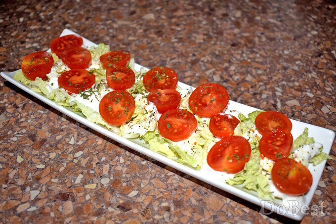 ![]() Zutaten Chinakohl — nach Geschmack Cherrytomaten — nach Geschmack Saure Sahne — nach Geschmack Salz oder Universalgewürz — nach Geschmack Schwarzer Pfeffer, gemahlen — nach Geschmack Getrocknete Petersilie — eine Prise ![]() Zubereitung Chinakohl schneiden. ![]() Auf einer Servierplatte anrichten. ![]() Den Chinakohl mit einer Zickzack-Schicht saurer Sahne bedecken. ![]() Salzen und mit gemahlenem schwarzem Pfeffer würzen. ![]() Die Cherrytomaten halbieren und schräg in Dreiergruppen anrichten. ![]() Etwas salzen und mit einer Prise getrockneter Petersilie für die Optik würzen. ![]() |