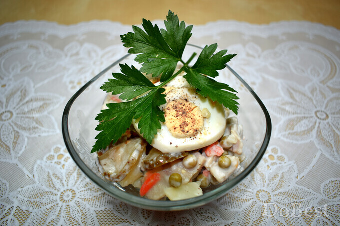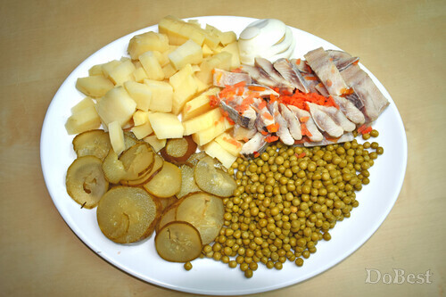 ![]() Ingredientes Patatas cocidas — al gusto Arenque en escabeche con zanahorias — al gusto Guisantes verdes en conserva — al gusto Pepinillos encurtidos — al gusto Huevos cocidos — al gusto Pimienta negra molida — al gusto Perejil fresco o eneldo — para decorar Mayonesa o salsa a base de mayonesa — al gusto ![]() Preparación Corte las patatas en cubos. Corte los pepinillos en rodajas. Corte los huevos cocidos en rodajas. ![]() Mezcle el arenque en escabeche, las patatas, los pepinillos y los guisantes en conserva. Aderece la ensalada con mayonesa o salsa a base de mayonesa. Coloque las rodajas de huevo cocido encima y sazone con pimienta negra molida. Decore el plato con una ramita de perejil o eneldo.