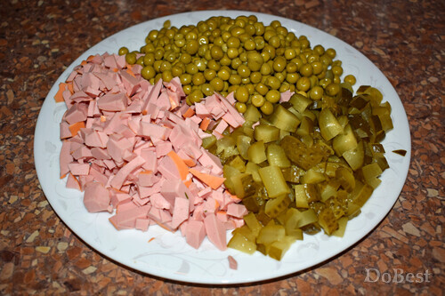 ![]() Ingredientes Salchicha de mortadela — al gusto Guisantes verdes en conserva — al gusto Pepinillos encurtidos — al gusto Sal — al gusto Mayonesa — al gusto ![]() Preparación Pique la salchicha y los pepinillos. ![]() Mezcle todos los ingredientes. Aderece la ensalada con mayonesa. Añada sal y decore con una ramita de eneldo o perejil si lo desea.