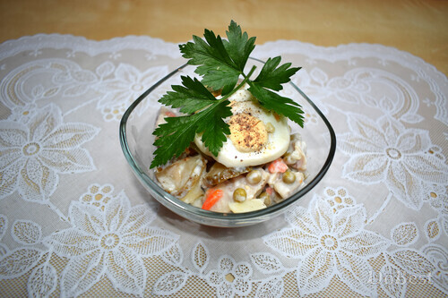 ![]() Ингредиенты Вареный картофель — по вкусу Маринованная сельдь с морковью — по вкусу Консервированный зеленый горошек — по вкусу Маринованные огурцы — по вкусу Отварные яйца — по вкусу Перец черный молотый — по вкусу Свежая петрушка или укроп — для украшения Майонез или соус на майонезной основе — по вкусу ![]() Приготовление Нарезать кубиками картофель. Кольцами нарезать маринованные огурцы. Нарезать кольцами вареные яйца. ![]() Перемешать маринованную сельдь, картофель, маринованные огурцы и консервированный зеленый горошек. Заправить салат майонезом или соусом на майонезной основе. Выложить кольцами вареное яйцо и сверху немного приправить черным молотым перцем. Украсить салат веточкой петрушки или укропа. ![]() Смотрите также...