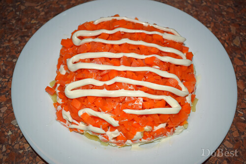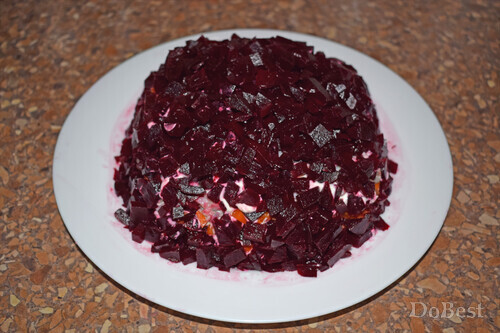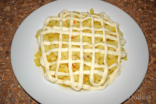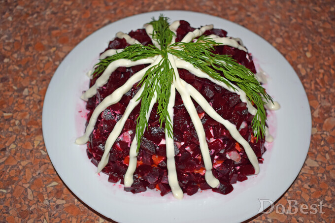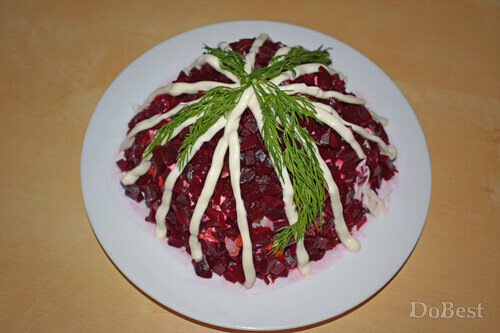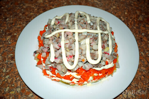 ![]() Ингредиенты Маринованное филе сельди — по вкусу Отварная свекла — по вкусу Отварной картофель — по вкусу Отварная морковь — по вкусу Соль — по вкусу Майонез — по вкусу ![]() Приготовление Нарезать сельдь, свеклу, картофель и морковь. ![]() Выложить слой картофеля на тарелку. Сверху покрыть майонезной сеточкой. ![]() Выложить слой моркови. Сверху покрыть майонезной сеточкой. ![]() Выложить слой сельди. Сверху покрыть майонезной сеточкой. ![]() Выложить слой свеклы поверх всей формы салата. Украсить декоративными "дорожками" майонеза и пучком укропа. ![]() Смотрите также...
