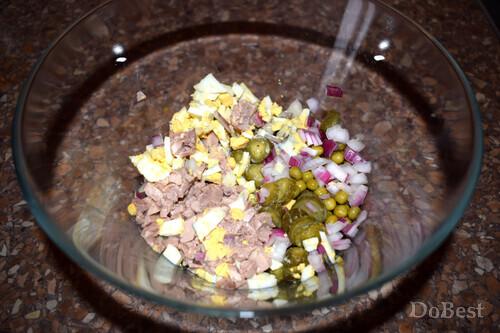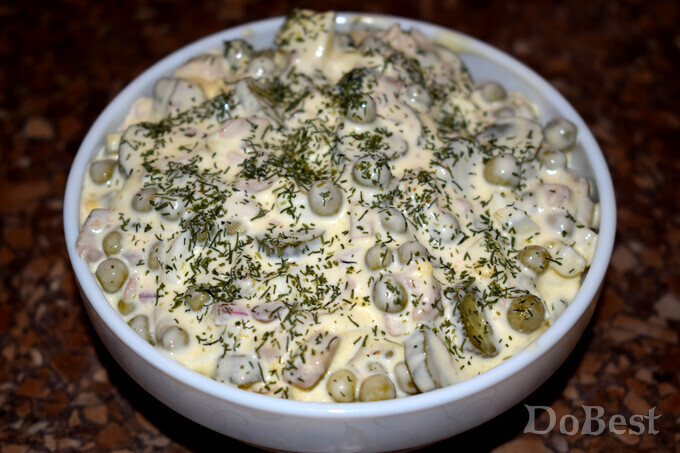 ![]() Ингредиенты Консервированная печень трески — по вкусу Консервированный зеленый горошек — по вкусу Маринованные огурцы — по вкусу Куриные яйца — по вкусу Репчатый лук — по вкусу Соль — по вкусу Майонез — по вкусу ![]() Приготовление Нарезать огурцы, яйца, лук. Измельчить печень трески. ![]() Смешать все ингредиенты, включая консервированный горошек. ![]() Посолить (по желанию), заправить майонезом. Перемешать. ![]() Смотрите также...