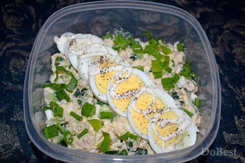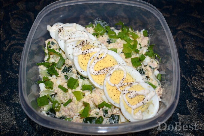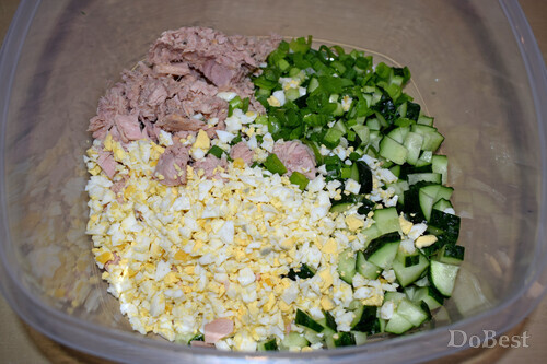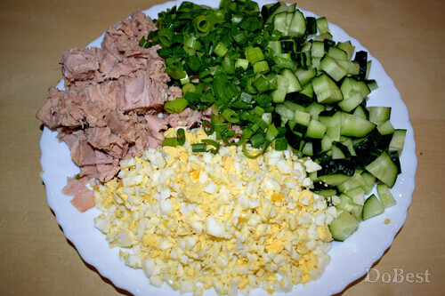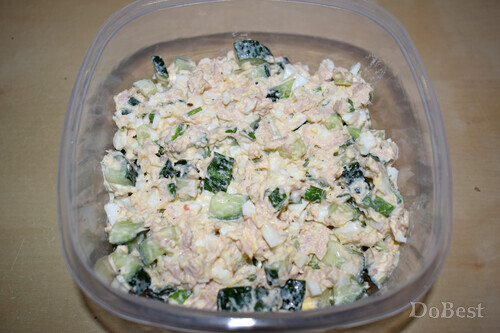 ![]() Ингредиенты Консервированный тунец в собственном соку — по вкусу Огурцы — по вкусу Куриные яйца — по вкусу Зеленый лук — по вкусу Соль — по вкусу Перец черный молотый — по вкусу Майонез — по вкусу ![]() Приготовление Нарезать огурцы, яйца, лук. ![]() Смешать все ингредиенты с консервированным тунцом. ![]() Посолить, поперчить и заправить майонезом. Перемешать. Украсить яйцом и зеленым луком. ![]() Смотрите также...