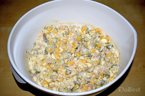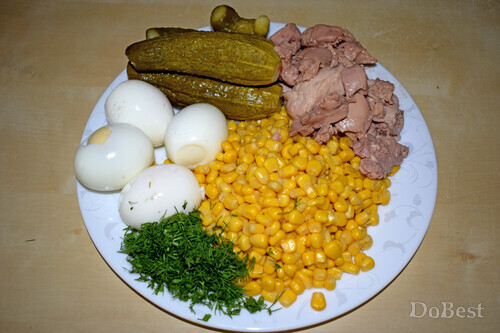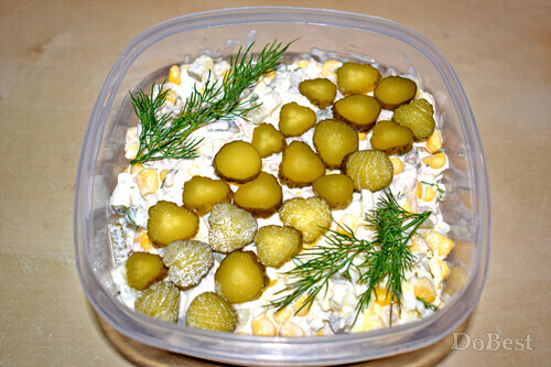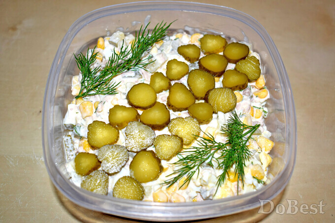 ![]() Ингредиенты Консервированная печень трески — по вкусу Консервированная кукуруза — по вкусу Маринованные огурцы — по вкусу Куриные яйца — по вкусу Укроп — по вкусу Соль — по вкусу Майонез — по вкусу ![]() Приготовление Нарезать огурцы, яйца. Измельчить укроп и печень трески. ![]() Смешать все ингредиенты, включая консервированную кукурузу. ![]() Посолить (по желанию), заправить майонезом. Перемешать. Украсить маринованным огурчиком и веточками укропа. ![]() |