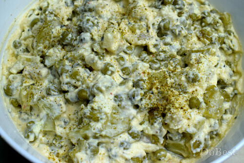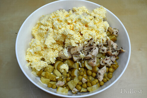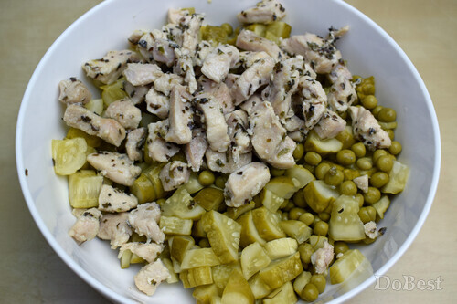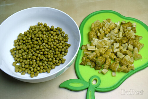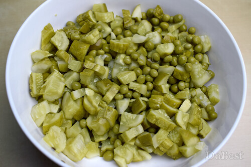 Нарезать кубиками маринованные огурцы и добавить к горошку.