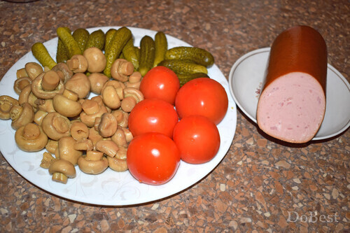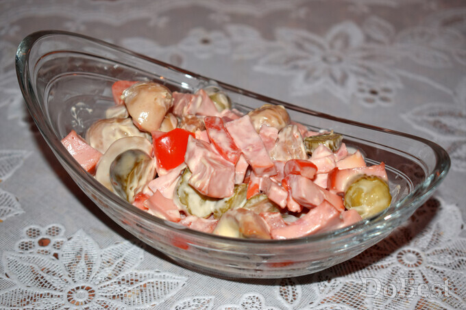 ![]() Ингредиенты Докторская колбаса — по вкусу Маринованные шампиньоны — по вкусу Маринованные огурцы — по вкусу Помидоры — по вкусу Соль — по вкусу Майонез — по вкусу ![]() Приготовление Нарезать колбасу, маринованные шампиньоны, маринованные огурцы и помидоры. Смешать все ингредиенты в салатнице. ![]() Заправить салат майонезом и хорошо перемешать. Посолить, если требуется. ![]() Смотрите также...