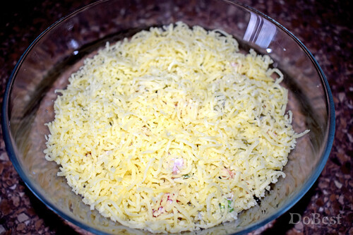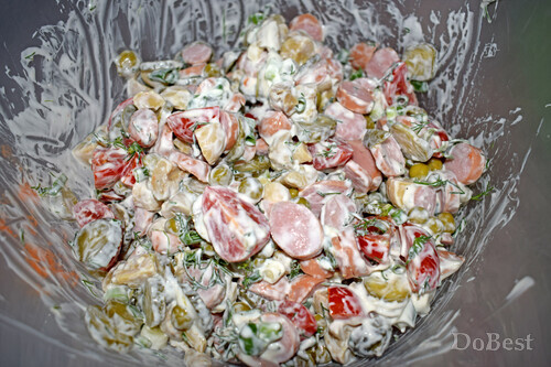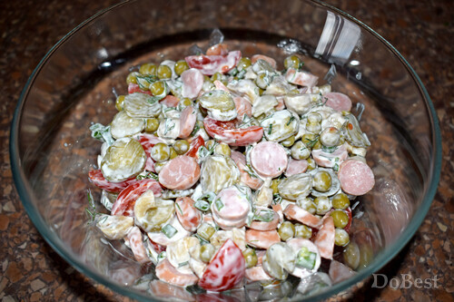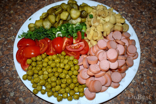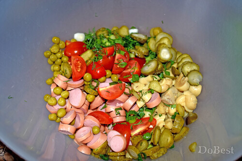 ![]() Ингредиенты Сосиски — по вкусу Консервированный зеленый горошек — по вкусу Маринованные огурцы — по вкусу Маринованные шампиньоны — по вкусу Помидоры-черри — по вкусу Зеленый лук — по вкусу Укроп — по вкусу Твердый сыр — по вкусу Майонез — по вкусу ![]() ![]() Приготовление Нарезать колбасу, помидоры, огурцы, шампиньоны. Измельчить зелень. Натереть на терке сыр. ![]() Смешать все, кроме сыра, в миске. ![]() Заправить майонезом. Перемешать. Выложить в салатницу. ![]() Сверху покрыть салат слоем тертого сыра. ![]() Украсить веточкой укропа и помидором-черри. ![]() Смотрите также...