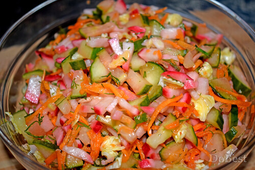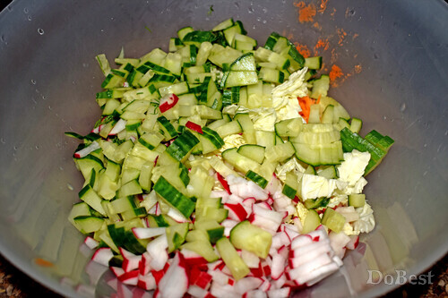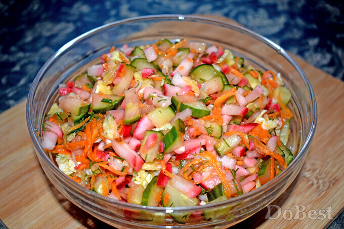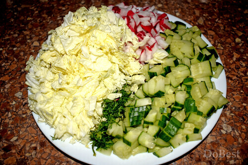 ![]() Ингредиенты Пекинская капуста — по вкусу Огурцы — по вкусу Морковь — по вкусу Редиска — по вкусу Укроп — по вкусу Соль — по вкусу Сахар — по вкусу Растительное масло — по вкусу Столовый уксус — по вкусу ![]() ![]() Приготовление Нарезать пекинскую капусту, огурцы, редиску, укроп. Натереть на терке морковь. ![]() Смешать все в салатнице. Добавить соль и сахар. Заправить несколькими столовыми ложками уксуса и растительного масла. Перемешать. Поставить в холодильник и дать настояться не менее часа. ![]() Смотрите также...