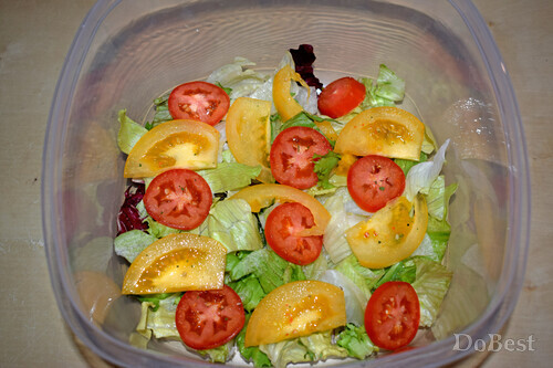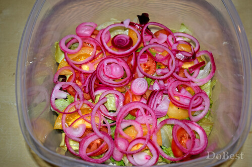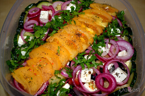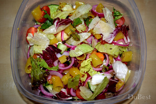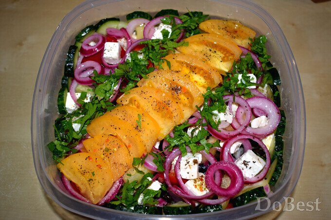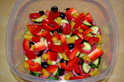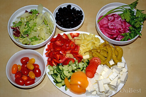 ![]() Ингредиенты Салатные листья — по вкусу Красный болгарский перец — по вкусу Белый или желтый болгарский перец — по вкусу Огурцы — по вкусу Сыр Фета — по вкусу Маслины — по вкусу Маринованный красный лук — по вкусу Желтые помидоры — по вкусу Красные помидоры — по вкусу Желтые помидоры-черри — по вкусу Красные помидоры-черри — по вкусу Маринованные перчики — по вкусу Петрушка — по вкусу Соль — по вкусу Сушеная зелень — по вкусу Перец черный молотый — для украшения Салатный соус — по вкусу ![]() Приготовление В салатницу выложить слой салатных листьев. Добавить немного салатного соуса. ![]() Выложить слой из крупных кусочков желтых и красных помидоров. ![]() Выложить слой маринованного красного лука. Добавить немного салатного соуса. ![]() Выложить слой из половинок оливок. ![]() Выложить слой из крупно нарезанных маринованных острых перчиков. Добавить немного салатного соуса. ![]() Выложить слой из крупно нарезанного красного болгарского перца. ![]() Выложить слой сыра Фета. Посолить его и посыпать сушеной зеленью. Добавить немного салатного соуса. ![]() Выложить слой из маринованного лука, салатных листьев, маринованных острых перчиков и половинок желтых и красных помидоров-черри. ![]() Выложить слой сыра Фета, посолить и посыпать сушеной зеленью. Добавить немного крупно нарезанных кусочков белого или желтого болгарского перца. Добавить немного маринованного лука и салатного соуса. Украсить кусочками желтого помидора и свежей петрушкой. Поперчить. ![]() Смотрите также...
