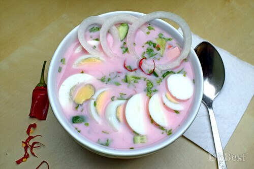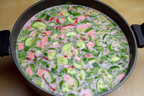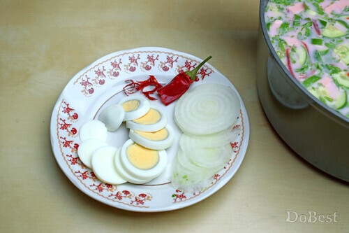 ![]() Ингредиенты Питьевая вода — в зависимости от величины кастрюли Кефир — обычно хватает 1 л Маринованная свекла — обычно хватает одной стандартной банки Огурцы — по вкусу Докторская колбаса — по вкусу Зеленый лук — по вкусу Укроп — по вкусу Петрушка — по вкусу Куриные яйца — по вкусу Лук — по вкусу Перец красный острый — по вкусу ![]() Приготовление Нарезать огурцы и колбасу, измельчить зелень. Налить в кастрюлю кефир. Добавить маринованную свеклу, огурцы, колбасу и зелень. Долить необходимое количество воды. ![]() Перед подачей добавить в суп яйцо и чуть-чуть красного острого перца, а также пару-тройку колец белого или красного лука. ![]() ![]() Смотрите также...