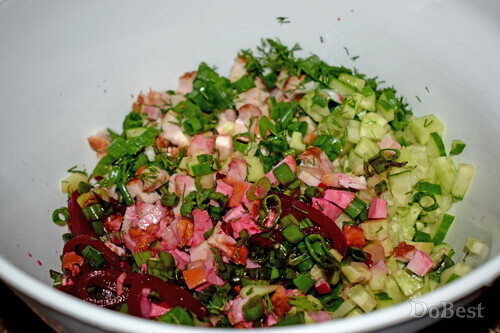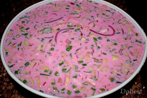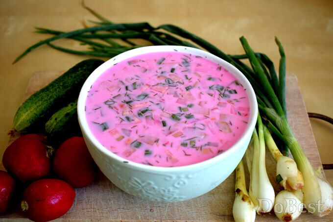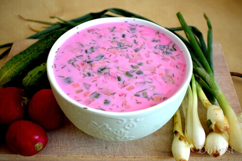 ![]() Ингредиенты Питьевая вода — по вкусу Кефир — по вкусу Огуречный рассол — по вкусу Маринованная свекла — по вкусу Куриное мясо горячего копчения — по вкусу Огурцы — по вкусу Редиска — по вкусу Зеленый лук — по вкусу Укроп — по вкусу ![]() ![]() Приготовление Нарезать куриное мясо, огурцы, редиску, зеленый лук, укроп. ![]() Смешать все в удобной емкости, включая свеклу вместе с маринадом. ![]() Добавить воду, кефир и огуречный рассол. Перемешать. ![]() Смотрите также...