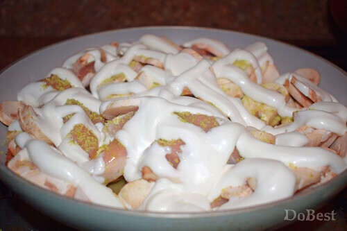 ![]() Ингредиенты Куриное филе — по вкусу Шампиньоны — по вкусу Соль — по вкусу Приправы — по вкусу Майонез — по вкусу