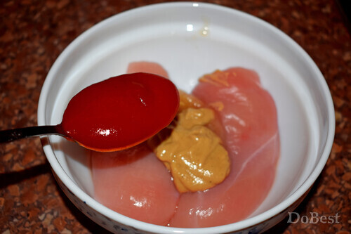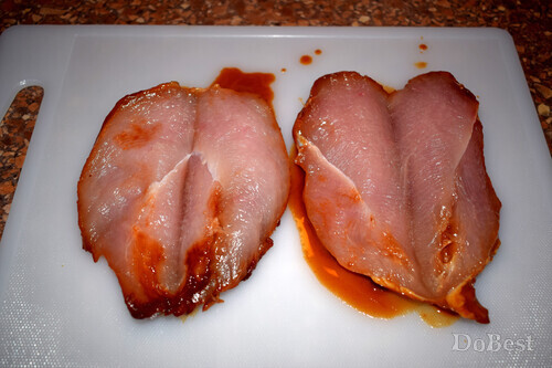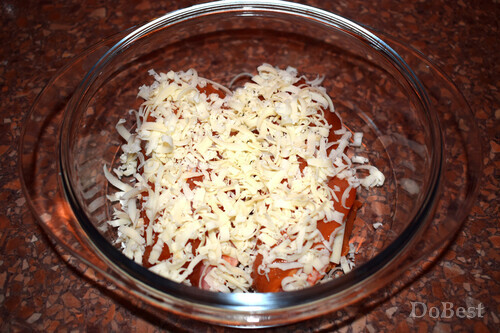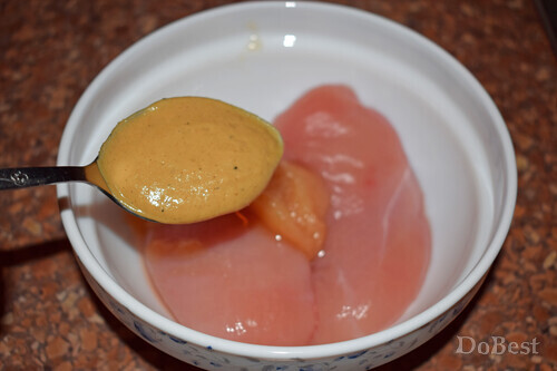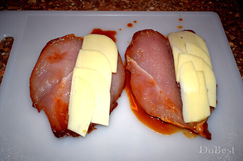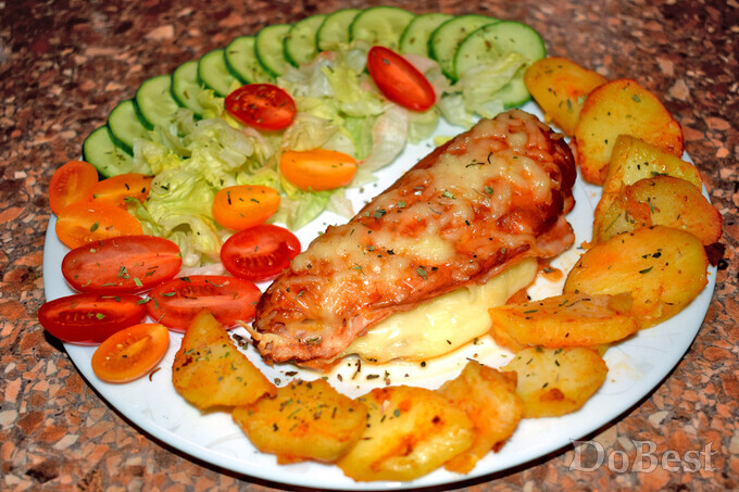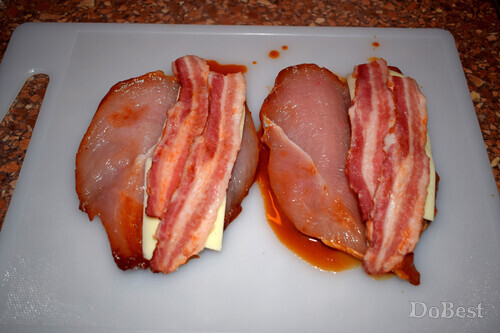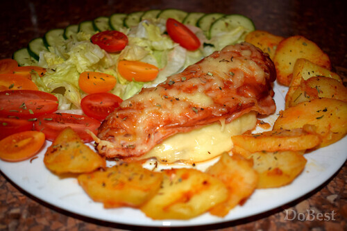 ![]() Ингредиенты Куриное филе — 2 шт. Бекон — 4 тонких ломтика Твердый сыр — по вкусу Мед — 1 ст. ложка Горчица — 1 ст. ложка Томатный соус — 1 ст. ложка Соевый соус — 1 ст. ложка Соль — щепотка Сахар — щепотка Орегано — по вкусу ![]() Приготовление Обжарить бекон на сковороде с обеих сторон. ![]() Положить филе в миску. ![]() Добавить столовую ложку меда, ![]() столовую ложку горчицы, ![]() столовую ложку томатной пасты или кетчупа, ![]() столовую ложку соевого соуса, щепотку соли и щепотку сахара. ![]() Перемешать и поставьте в холодильник . Мариновать не менее 6-ти часов. ![]() Сделать надрез посередине каждого филе. ![]() Выложить в ряд несколько кусочков сыра. ![]() Сверху положить кусочки бекона. ![]() "Закрыть" филе. ![]() Покрыть сверху слоем тертого сыра. Запекать в духовке 30 минут при температуре 180°. Перед подачей приправить филе щепоткой орегано. ![]() Смотрите также...